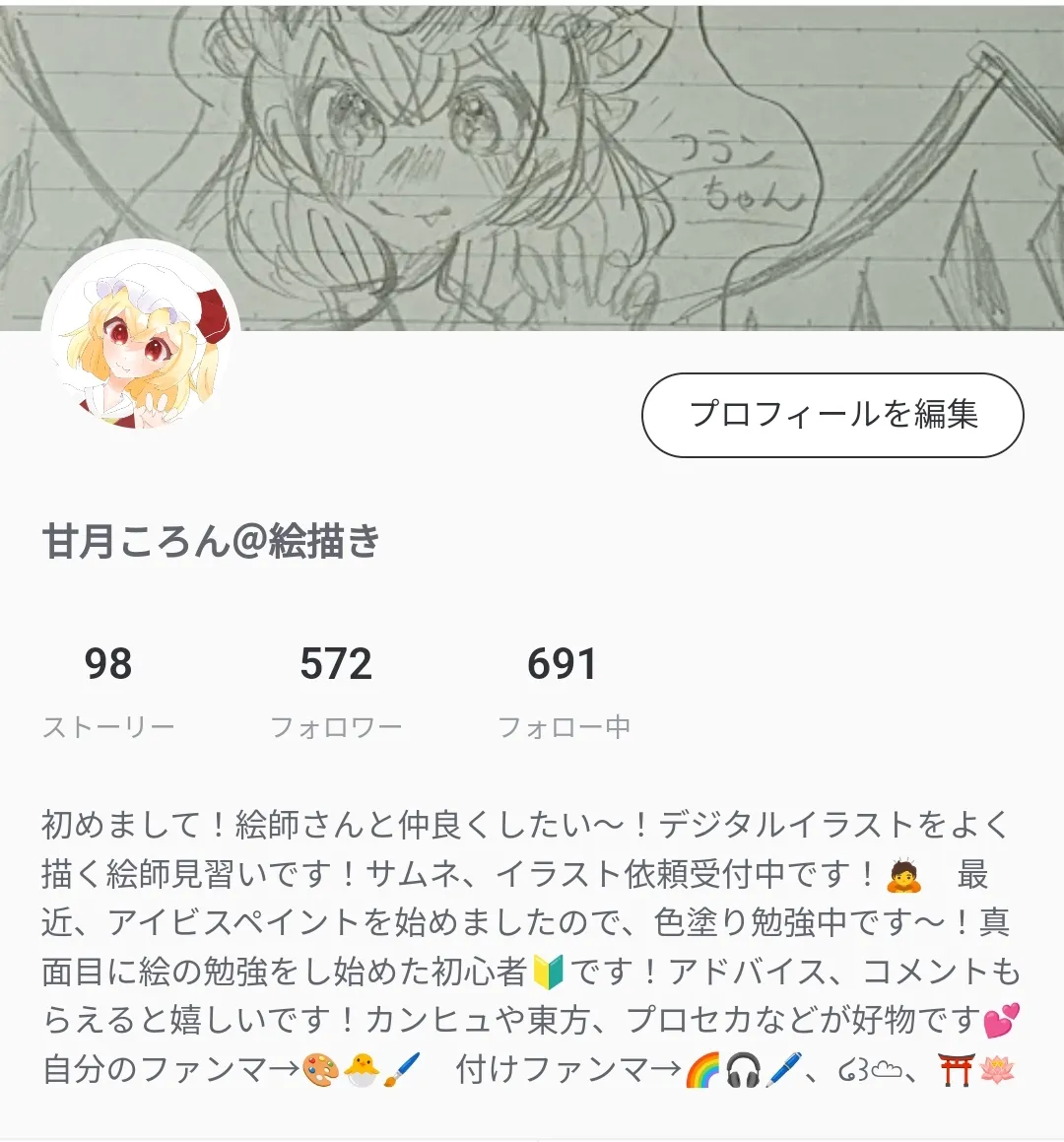 2025/2/2 23:18宣伝失礼します!初心者絵描きの甘月ころんと申します!アイコンやヘッダーの通り、フランちゃん、東方推しですので良ければ絡んでください!主に絵中心の活動をしていますので、絵師様とも絡みたいです!参考程度に最近の絵を投下しておきます!600人目標です!コメントくださった方にはフォロバーしてますのでよければフォローお願いします!