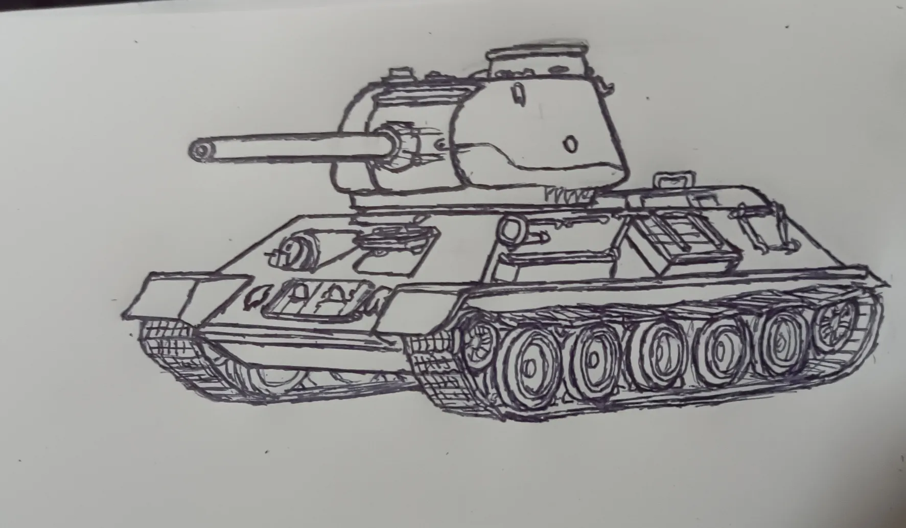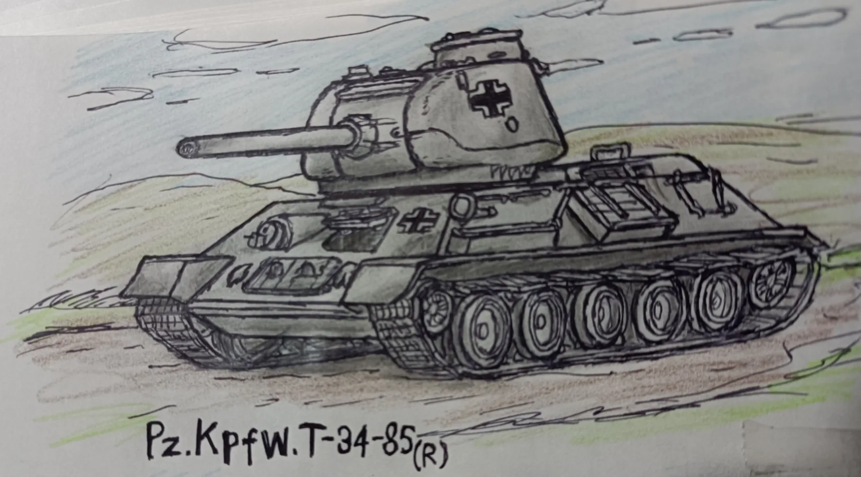 2026/2/20 14:52下描きをしてペンでなぞる→影とハーケンクロイツを入れる→適当に背景を入れればドイツ軍に鹵獲されたT-34-85中戦車の完成