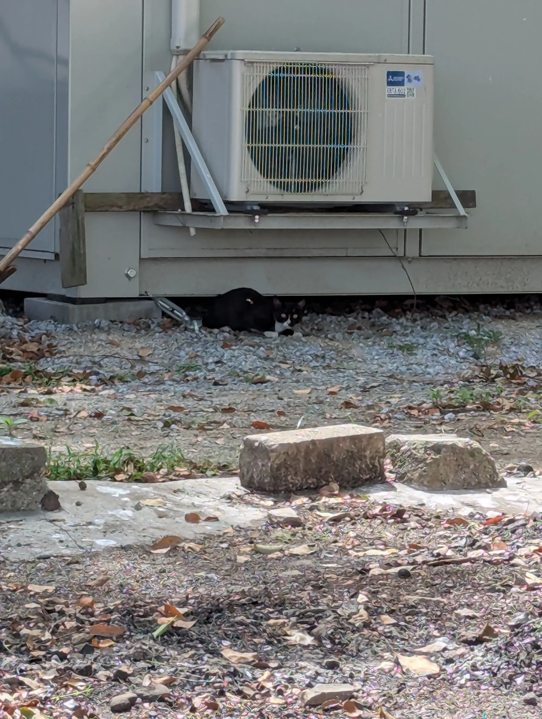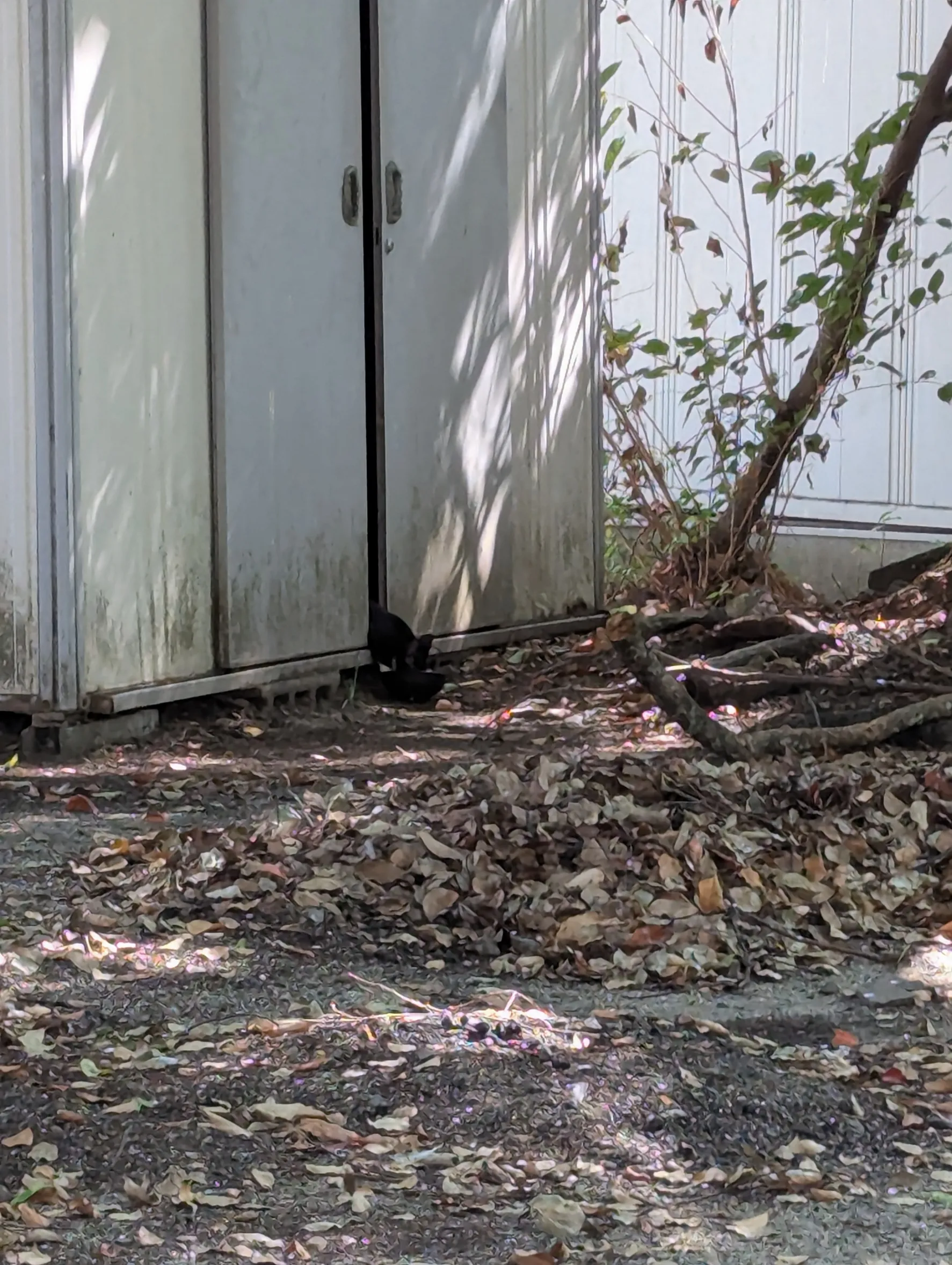 2025/8/27 15:34昨日、来なかったんだけど、1日来ないだけで、物置小屋が閉まってて、中に子猫のイサミちゃんが閉じ込められてた。掃除の人と一緒に開けた。すき間にカリカリ置いてたら食べた