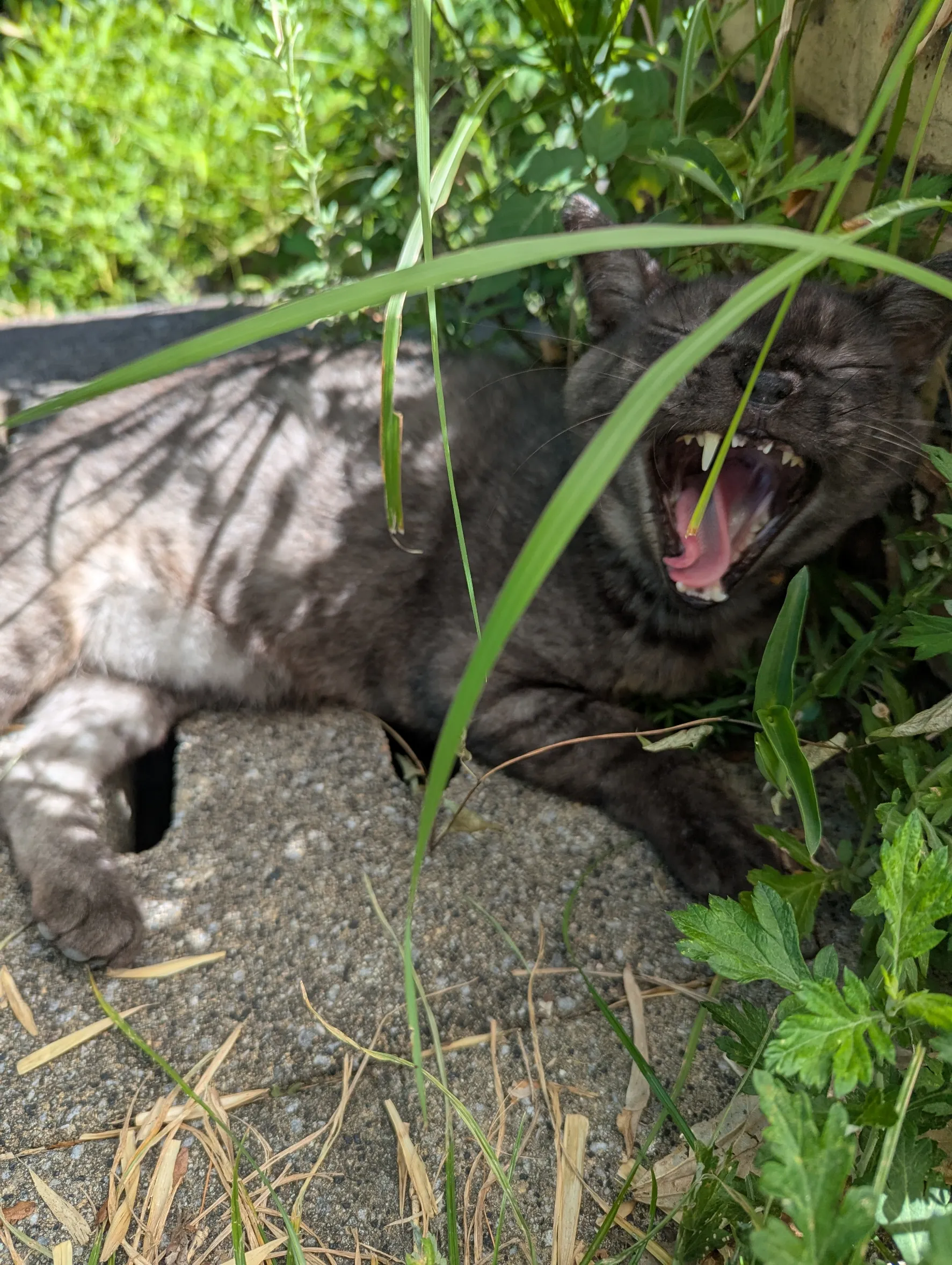 今日のアルちゃんは、花壇の向こう側から、すぐ出てきたよ。あくび顔は、可愛いね💕