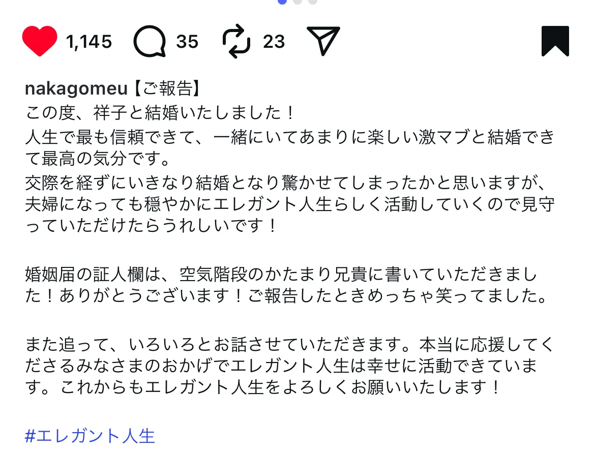エレガント人生さん結婚したのねおめでとう😭2人とも大好きだからほんとにご結婚がおめでたくておめでたくて仕方ない、うれしいインスタ開いた瞬間さけんだ