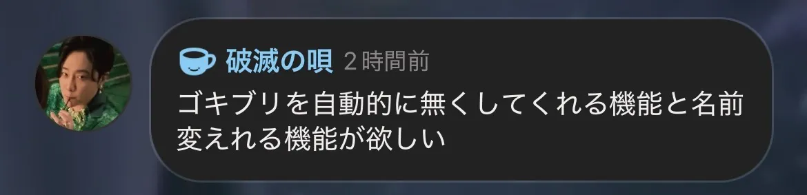 ゴキブリを自動的に無くしてくれる機能と名前変えれる機能が欲しい