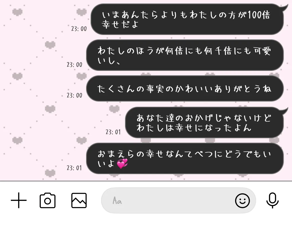 ごめんね。可愛いから許されちゃうのお前らと違って意見もはっきり言えちゃうから演説も大成功なの。勉強も出来て、優等生で、ノリよくて、こんなに可愛くて人生勝ち組ってやつっ?