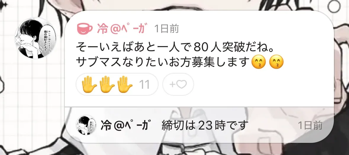 サブマスはモヤさんに決定〜っ!!!よろしくね😉瑠伊ちゃんサブマスありがとう‼️また次の機会にぜひ!!他の人たちもまた90人突破したらサブマス募集するのでまたリアクしてくれると嬉しいですー!😙😙😙