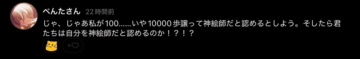 じゃ、じゃあ私が100……いや10000歩譲って神絵師だと認めるとしよう。そしたら君たちは自分を神絵師だと認めるのか!?!?