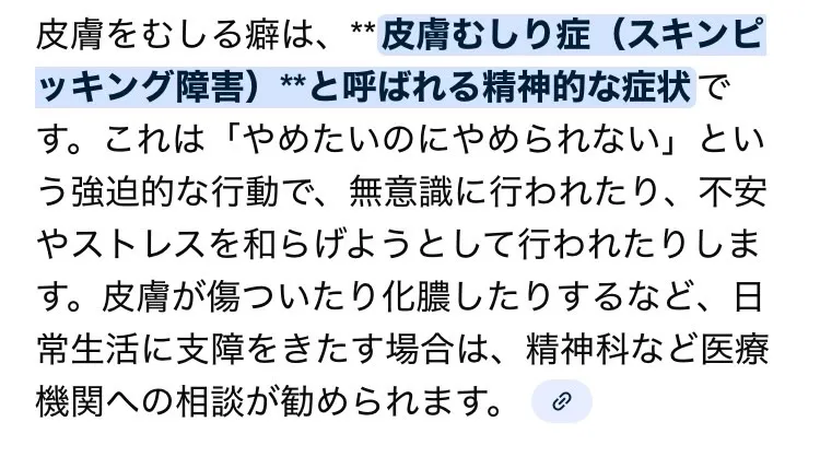 あ、ちなみに皮膚むしってる自分が100悪いです