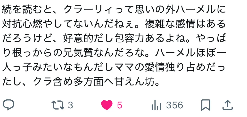 たしかにハーメルは甘えん坊なとこあるかもなー無印の最初の方でも「えーんライエル!」とかやってたもんね…ハーメルサイザー兄妹の絡みほんとにないよね…それこそ、「血が繋がってる」ってだけみたいな…2人とも双子なの認識してるし、兄、妹っていうのもちゃんと分かってるけど兄妹らしいシーンはない…ライサイシーンが多すぎるのか?