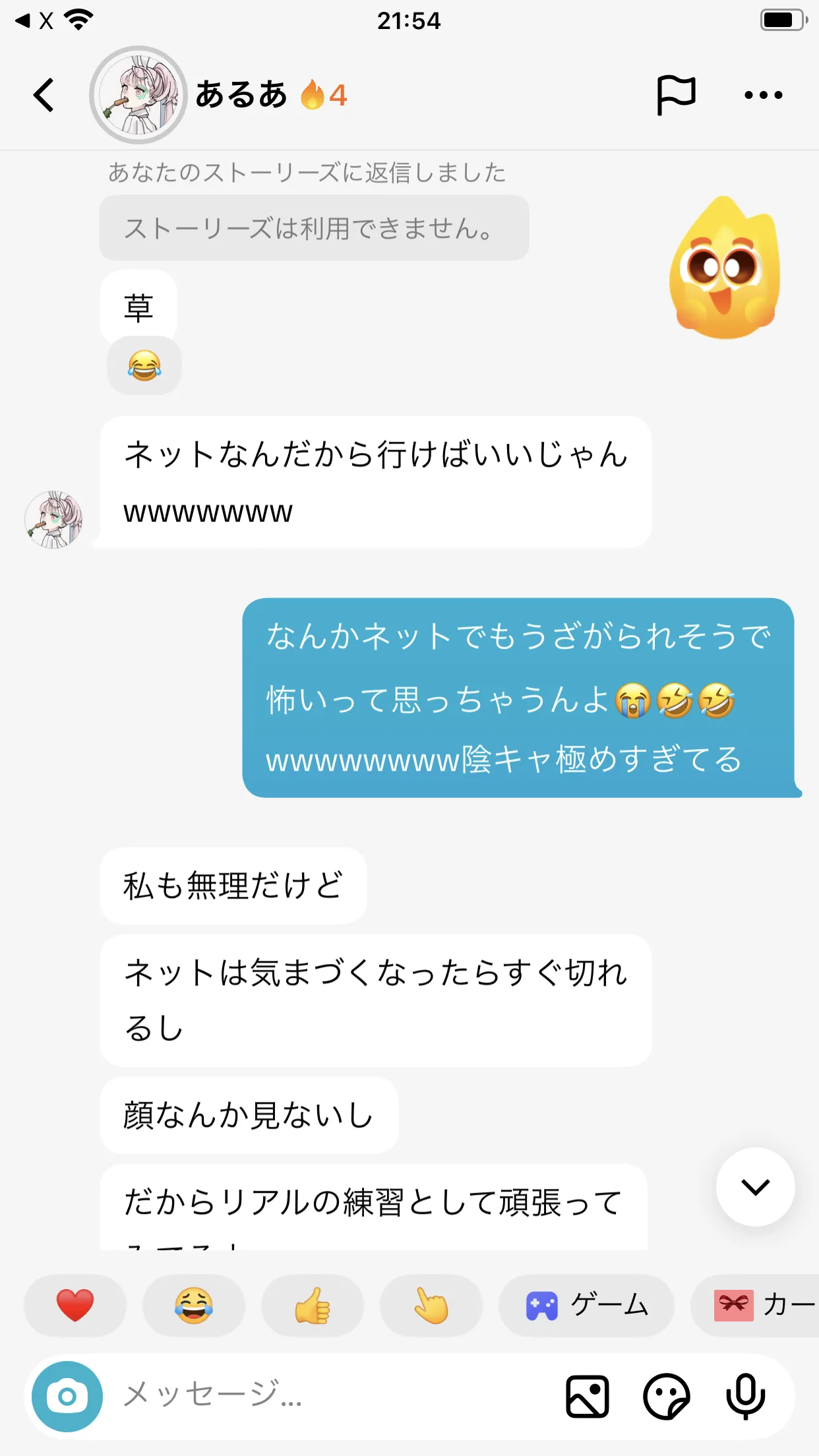 最近人と関わる事増えてたから生理中でも大丈夫かなとか思ってたけど駄目だったこっちが話しかけてばっかだからな、笑