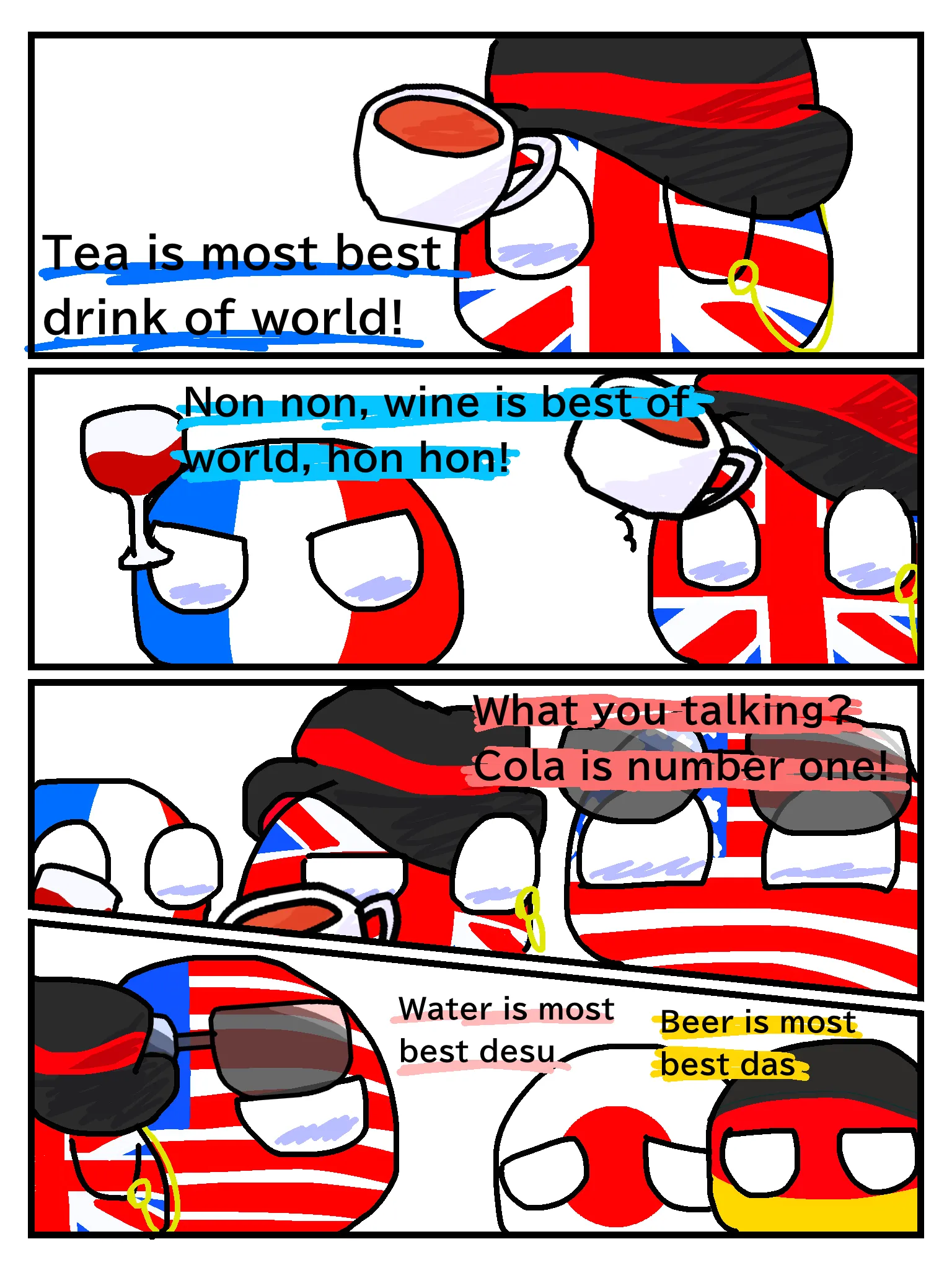 普通にキャラとして見て欲しいんですけどバングラさんって良くないですか??団子三兄弟(日本 パラオ バングラ)ネタとかありつつも日本とパラオコンビとかそれぞれのネタがある程度あるのでバングラの影が少し薄くなってしまうんですよ、バングラはもちろん良くは思ってないですけど遠い存在すぎてパラ日には言えずやるせない気持ちで居るみたいな、そんな妄想をして出来たのがさっきの絵です