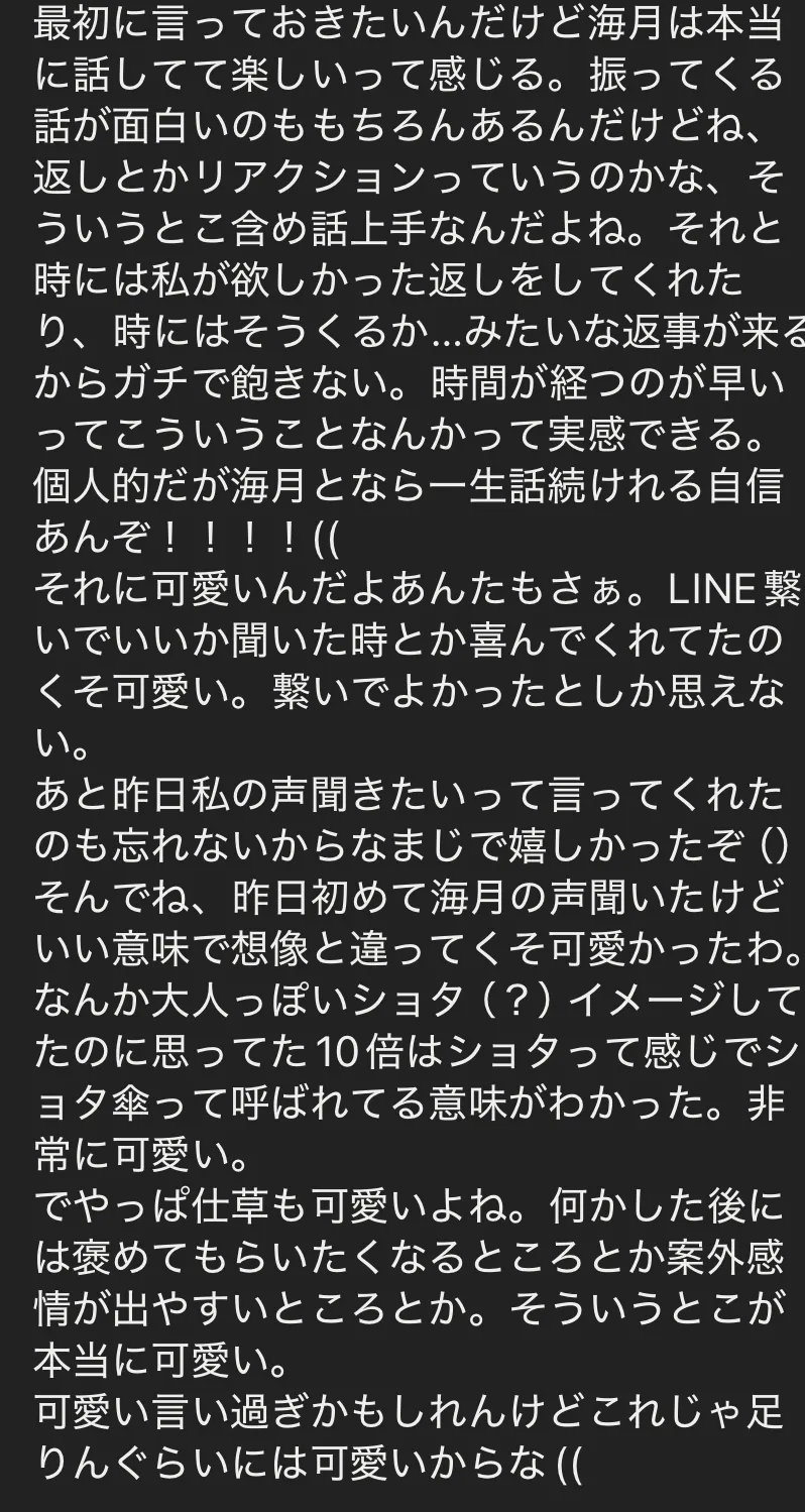 最初に言っておきたいんだけど海月は本当に話してて楽しいって感じる。振ってくる話が面白いのももちろんあるんだけどね、返しとかリアクションっていうのかな、そういうとこ含め話上手なんだよね。それと時には私が欲しかった返しをしてくれたり、時にはそうくるか…みたいな返事が来るからガチで飽きない。時間が経つのが早いってこういうことなんかって実感できる。
