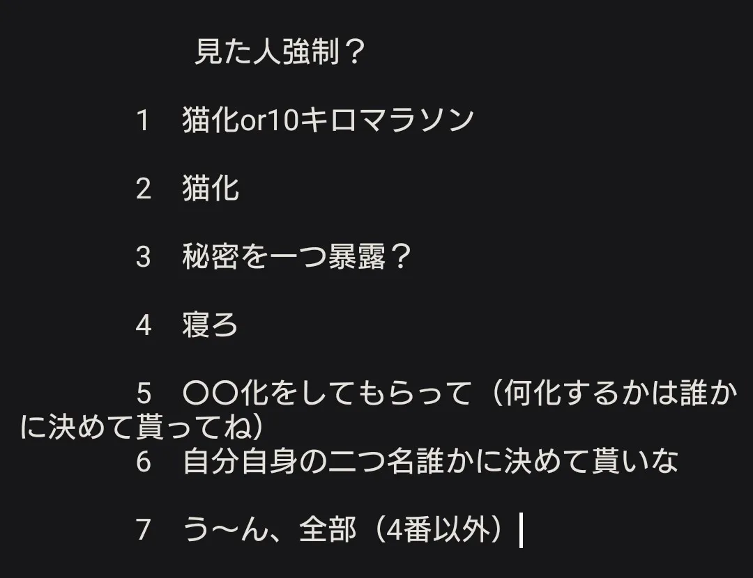 1、猫化にします。2、なっとる。3、秘密ナンテナイヨ。5、6、誰かに決めてもらいます。