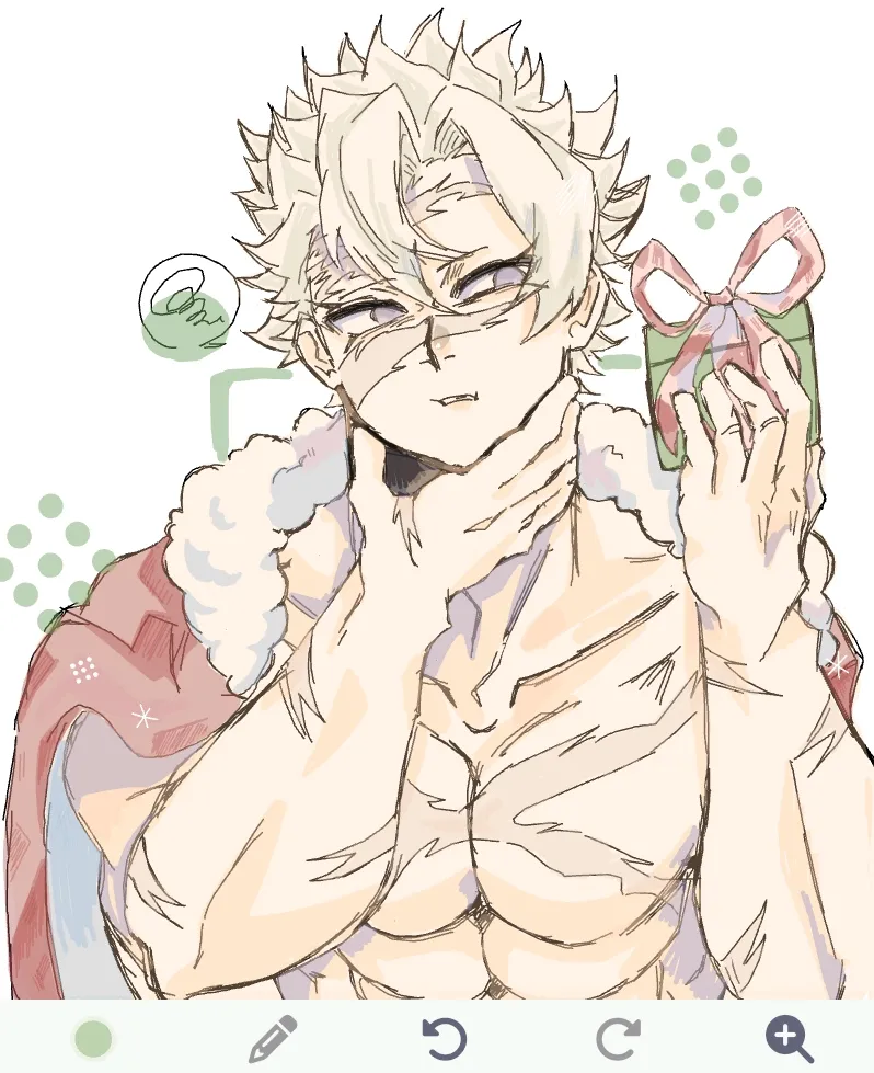 きゃーっ😳✨💗わざわざコメントありがとうございます😊🙏そうなんですよ実は上裸なんですよ😏💪🏻公式の方の実弥サンタが上裸っぽかったので……🤭🍃💚ほっぺモチモチ感出したかったからそこ気づいてもらえてうれちすぎる…🥹🙌玄弥へのプレゼントを悩んでるってことでね…