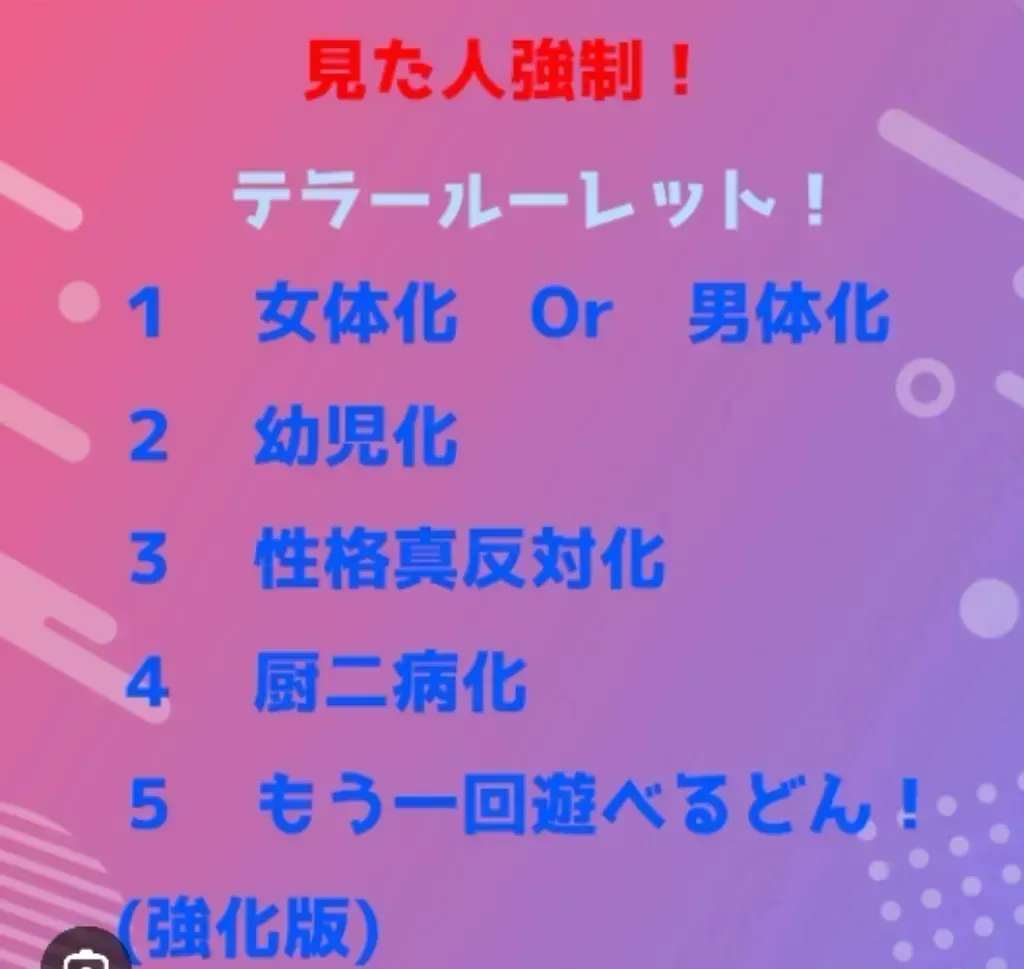 #ルーレット1.好きな人に大好き2.好きな人にちゅっ3.知らん人にちゅっ(ではなくてちゃんと寝る)4.早寝早起き5.愛のメッセージ
