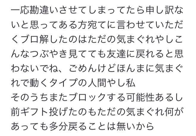 友達って思ってた人とケンカしてLINEとか色々ブロックされてたのに急にゲームだけブロ解されて急にフレ申してきたからもしかしたら友達に戻れるかもとか思ってフレンドになったの