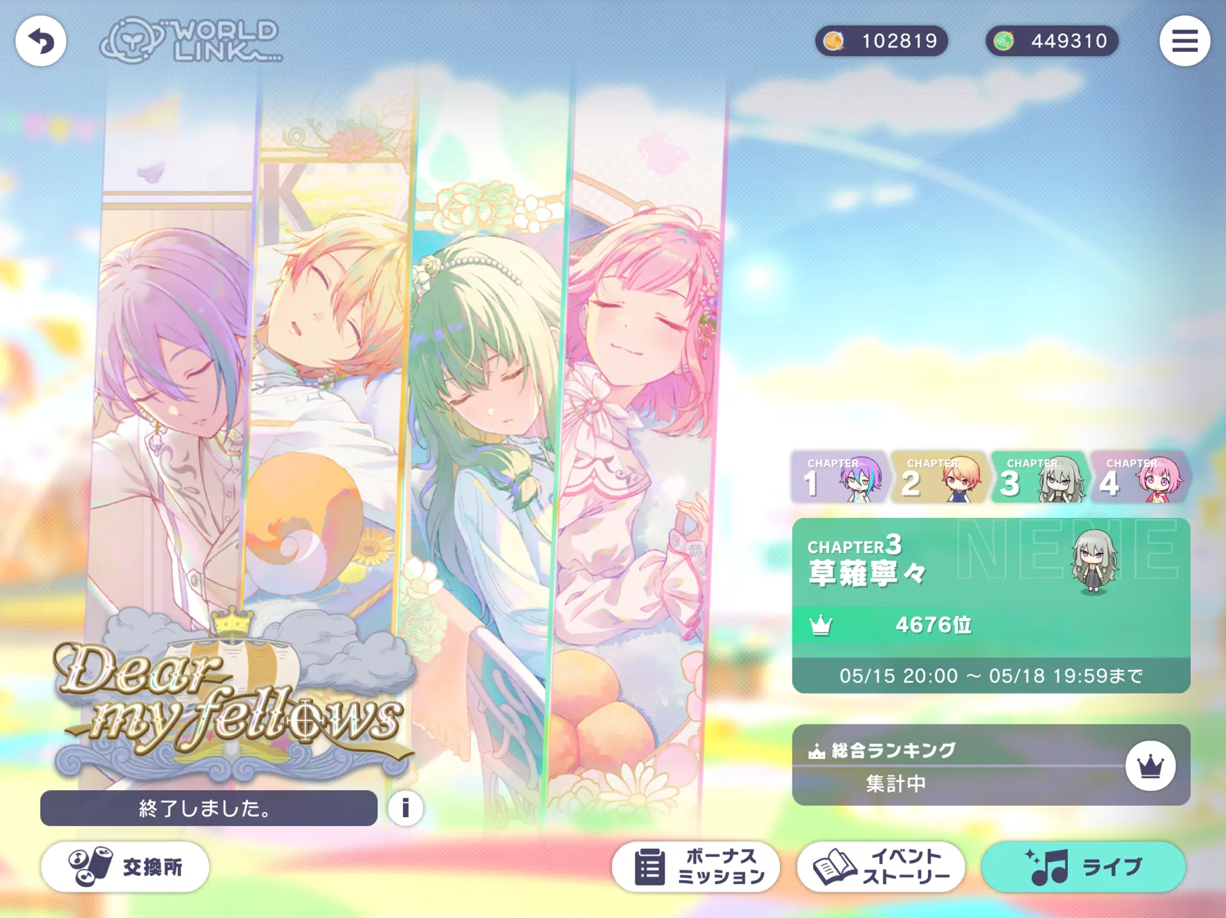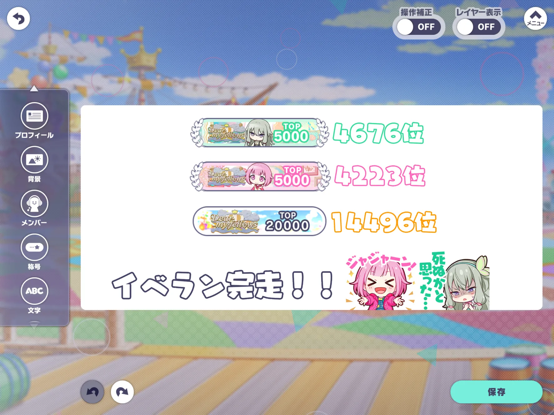 そいえば少し前くらいにイベラン完走しました!!TOP5000称号両方とも貰えたよ!!やった!!( (