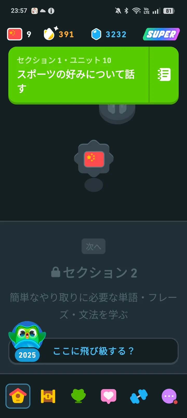 デュオリンゴしてますたあとちょっとでセクション2になるいまスポーツのやつやってるのでこれ終わったらセクション2!!!!!