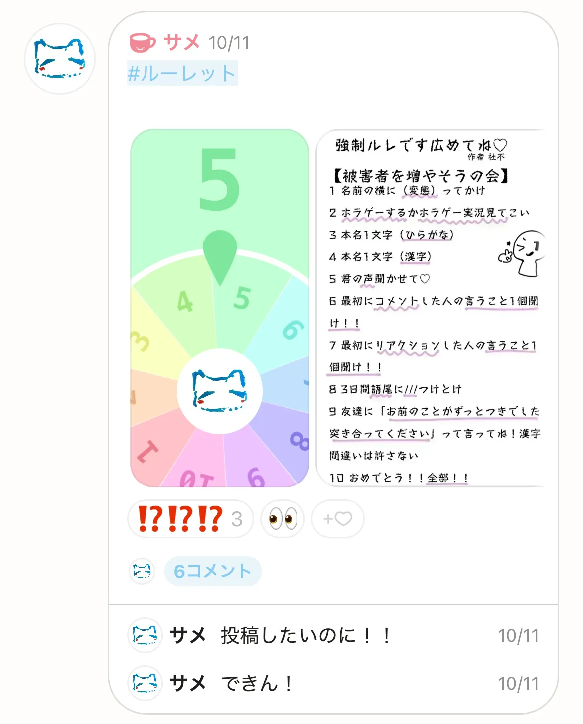 書き終わったけど、まだ投稿してないから閉めないよーまだやって欲しい人いたらリアクしてーサメが投稿したらアウトで