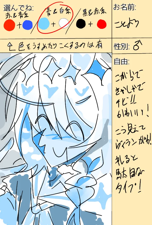 前にやったんだけどさ、俺(名前とか)をイメージしてキャラ作ってみてみたいなやつやったんだよ。確かまたやって!って言ったらやってくれますか?暇つぶしに🙃メチャラグい