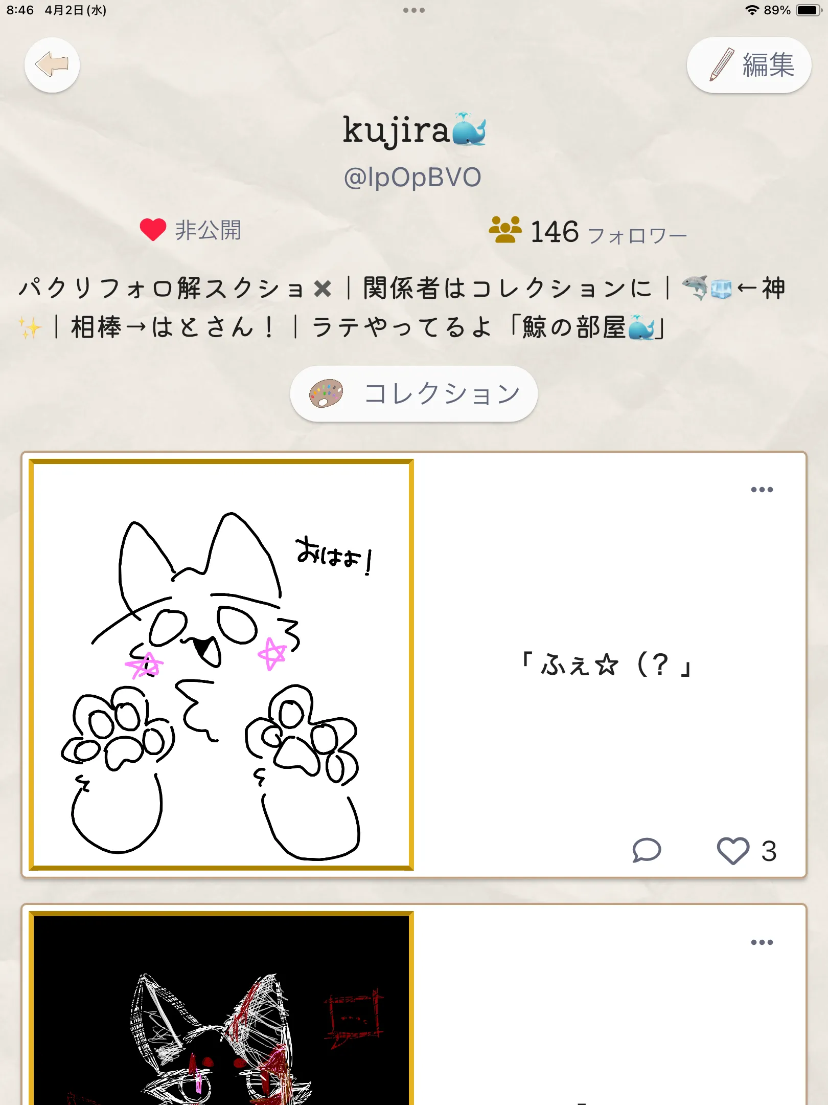 @lpOpBVOこのIDをお絵描き美術館っていうアプリでユーザー検索してみて!