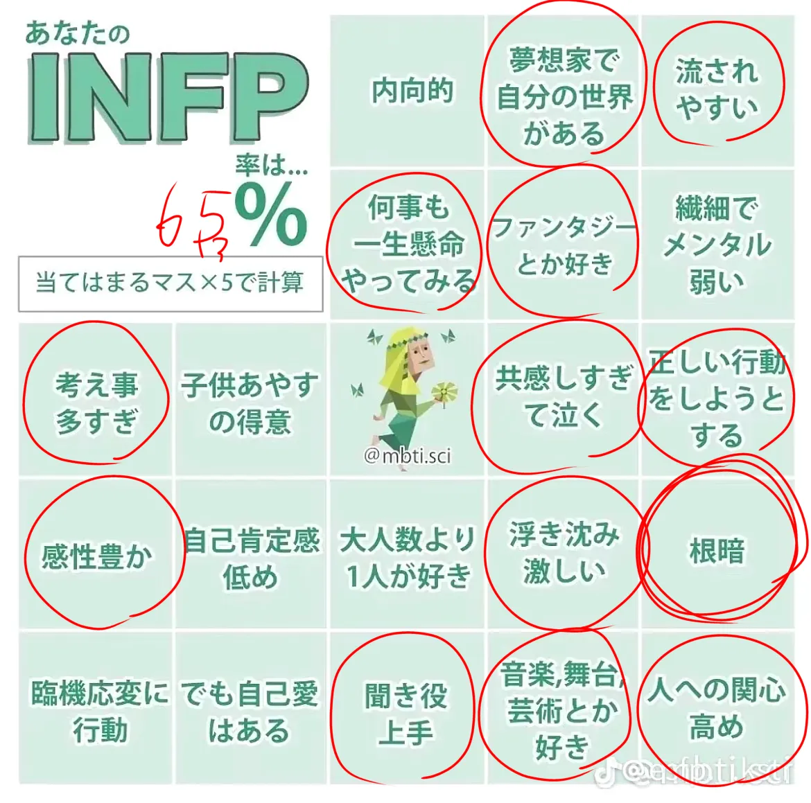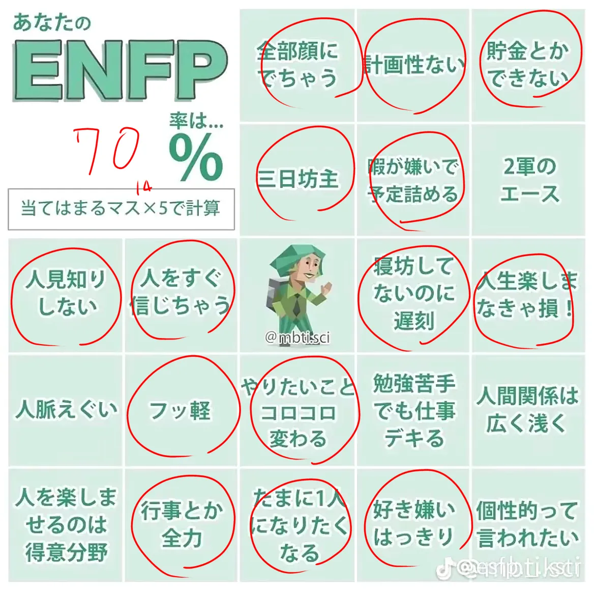 自分で丸つけんのはず😗😗ENFPです!!1回だけINFPが出たのでやってみました😆