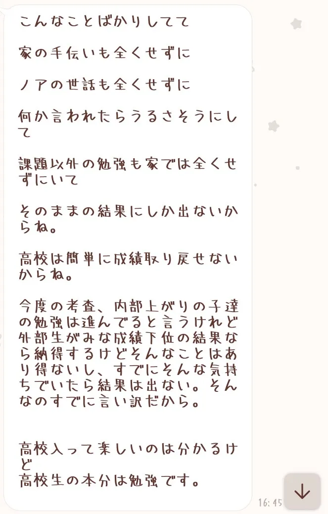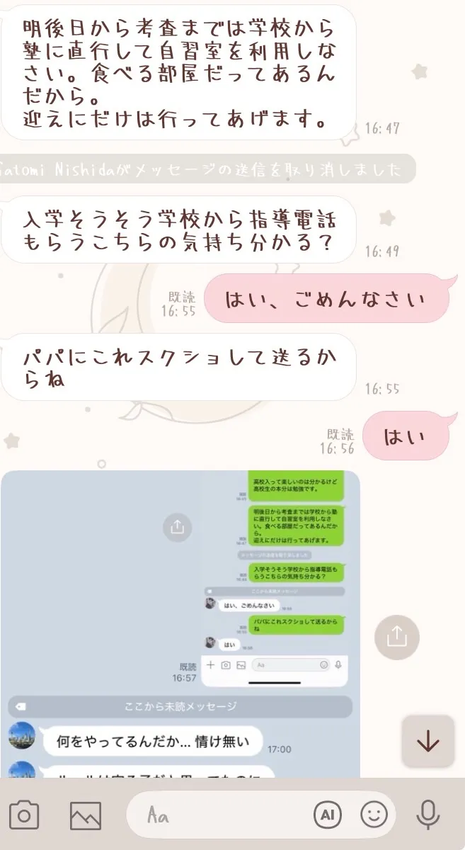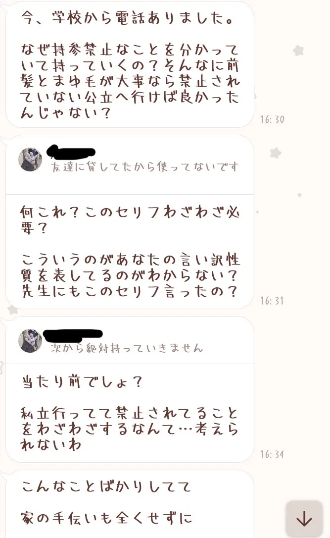 ちょっとみんなに私が水泳後のアイロンとメイク持ってったのばれて指導で親に電話いったときのお母さんからのLINEみてほしい