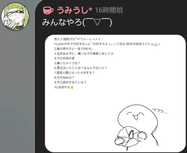 2025/10/22 16:11なんかね〜!ここの人たちを仲良くするために考えたんだけど、スプラトゥーン関係ない話もいいってことにしような…いやこれまで駄目とは言ってなかったけど一応ね、?みんな話しまくれ〜!