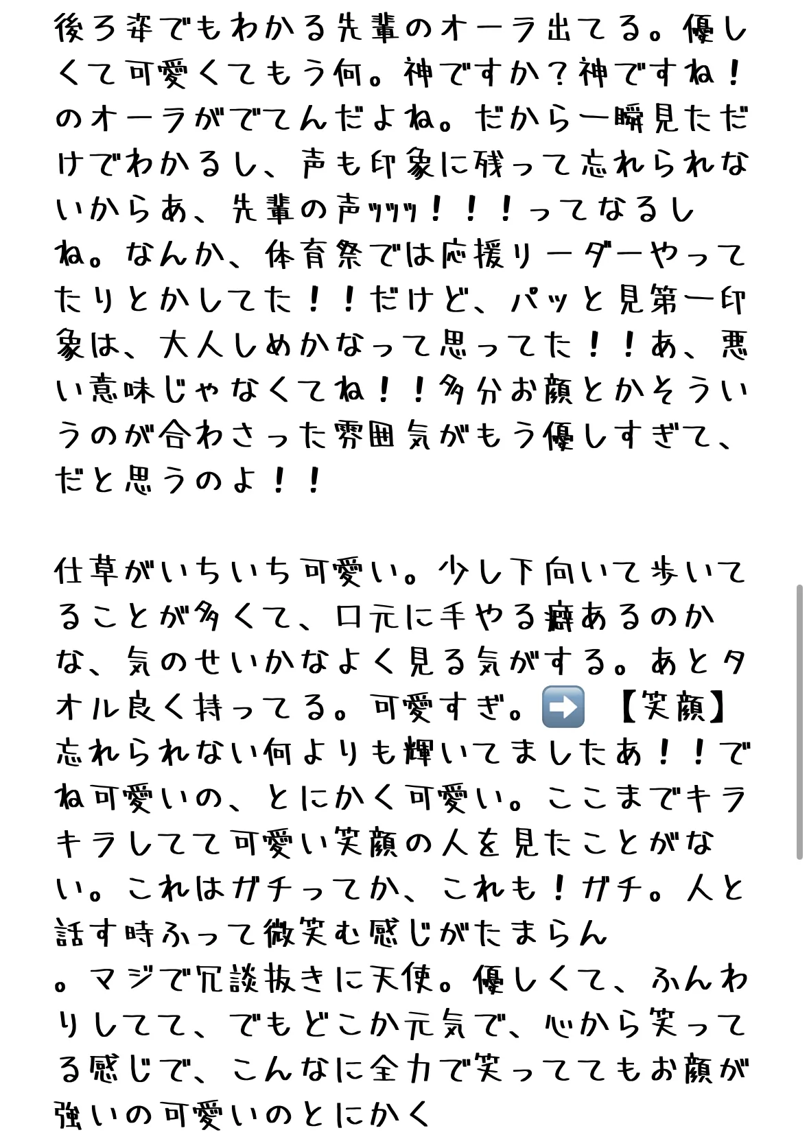 後ろ姿でもわかる先輩のオーラ出てる。優しくて可愛くてもう何。神ですか?神ですね!のオーラがでてんだよね。だから一瞬見ただけでわかるし、声も印象に残って忘れられないからあ、先輩の声ッッッ!!!ってなるしね。なんか、体育祭では応援リーダーやってたりとかしてた!!だけど、パッと見第一印象は、大人しめかなって思ってた!!あ、悪い意味じゃなくてね!!多分お顔とかそういうのが合わさった雰囲気がもう優しすぎて、だと思うのよ!!