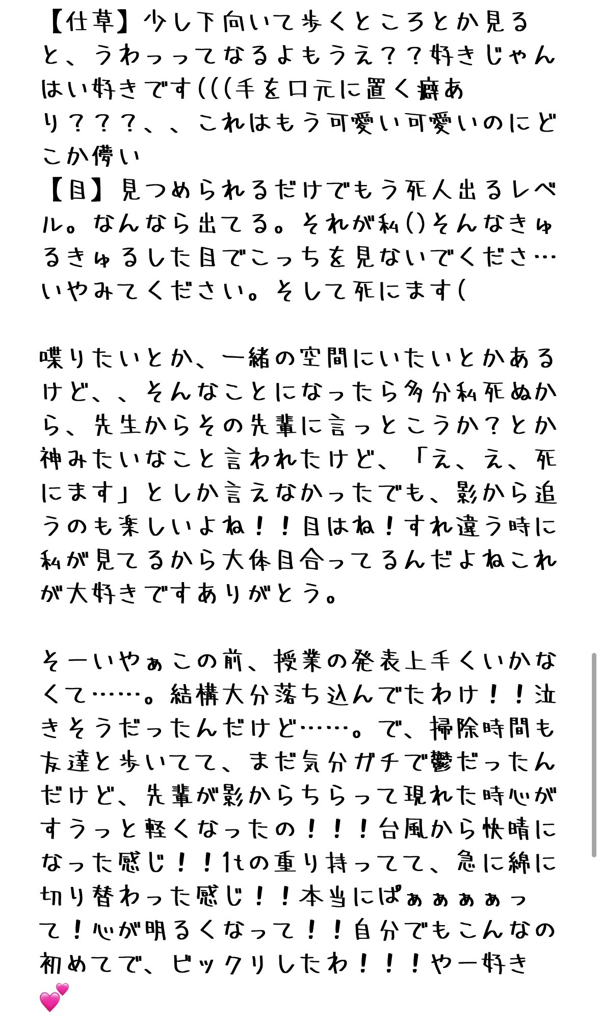 先輩は、ただ格好良い、可愛いから好きってだけじゃないんだよね!!周りの友達からはそう思われてるかもしれないけど。私にとって2人の先輩は、私の高校生活だけじゃなくて、私の人生のあたたかい救いの光だったんだよね!!!もちろん格好良いし可愛いのは当たり前だけど、、でもそれだけじゃなくて、毎日学校楽しみって思わせてくれる、毎日楽しいって思わせてくれる、憧れでもあるし、尊敬してる!何よりも、誰よりも輝いてて、優しくてあたたかい!先輩は曇ってた私の心を快晴に変えてくれた人!あらヤダ素敵✨