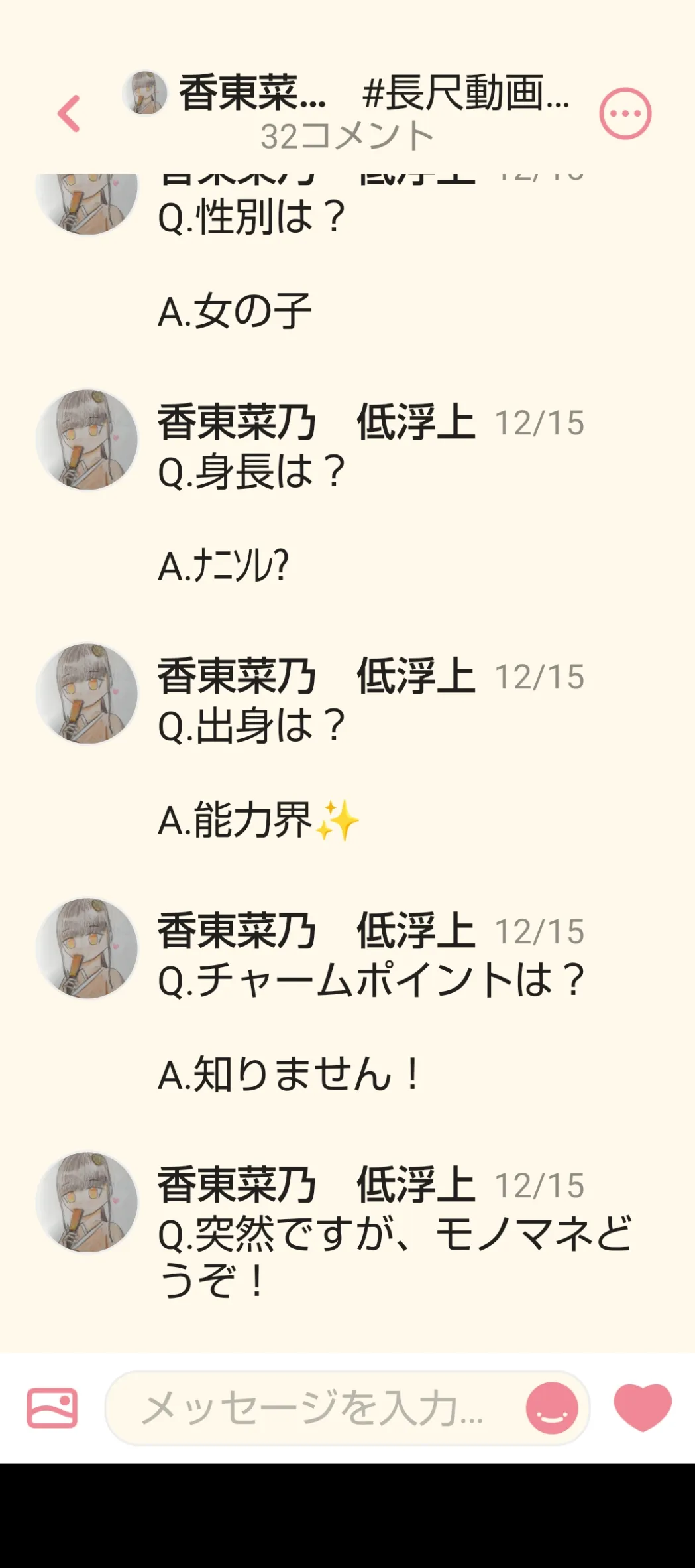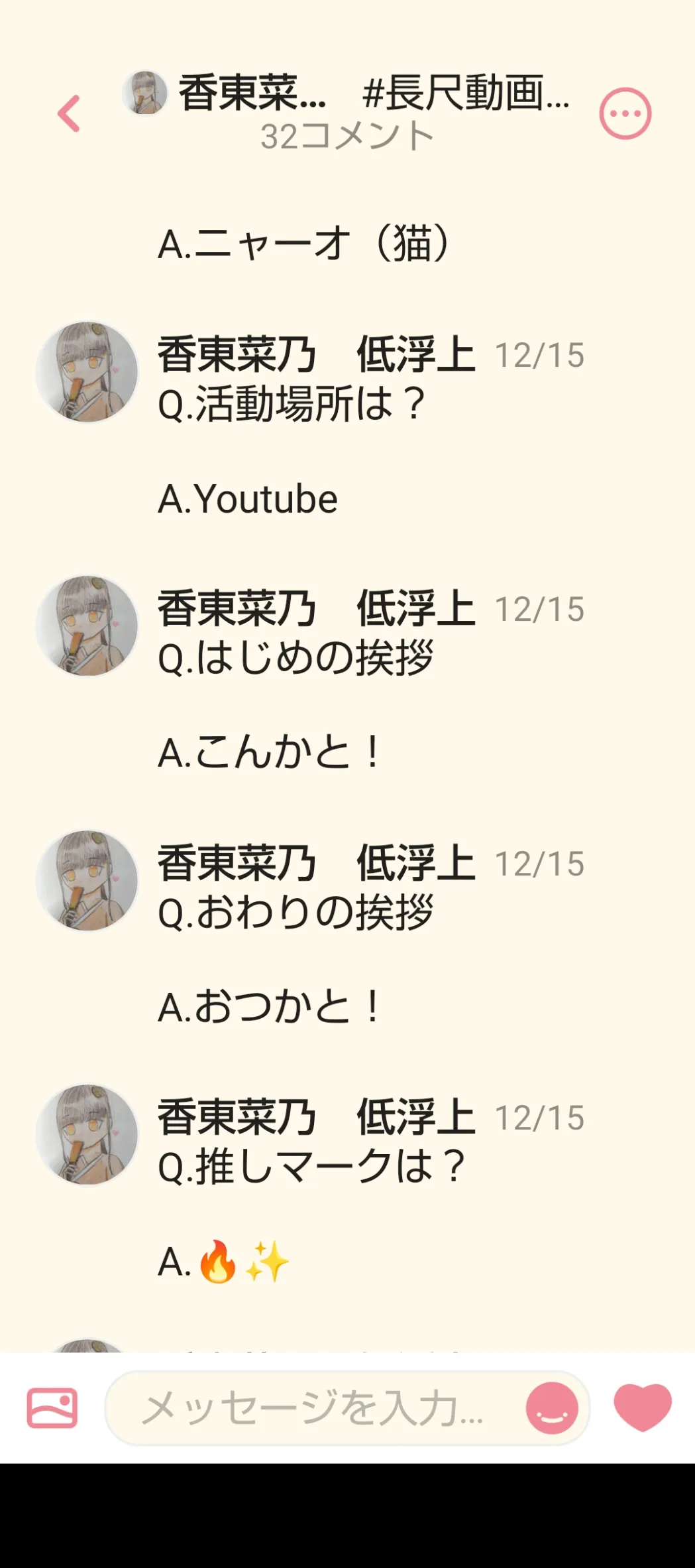 「Hello!你好!こんにちは〜!香東家の〜菜乃です!よろ願しま〜す」かな?前回の配信でも使ったんだけどね なんか三連続で似たような単語並べるの好きでw 「Hello」は英語、「你好」は簡体の中国語です!