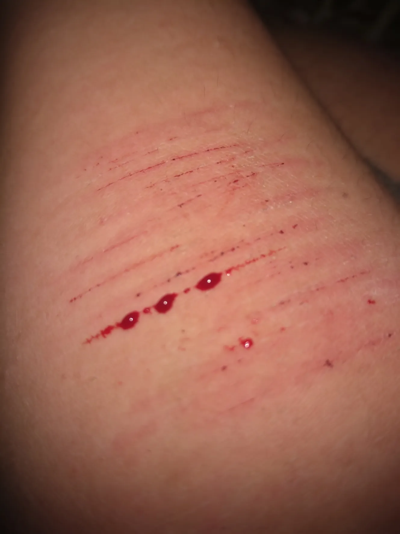 貝印のピンクの剃刀を腕にグッて押し込んで、ゆっくり動かしたら深く切れたよー!
