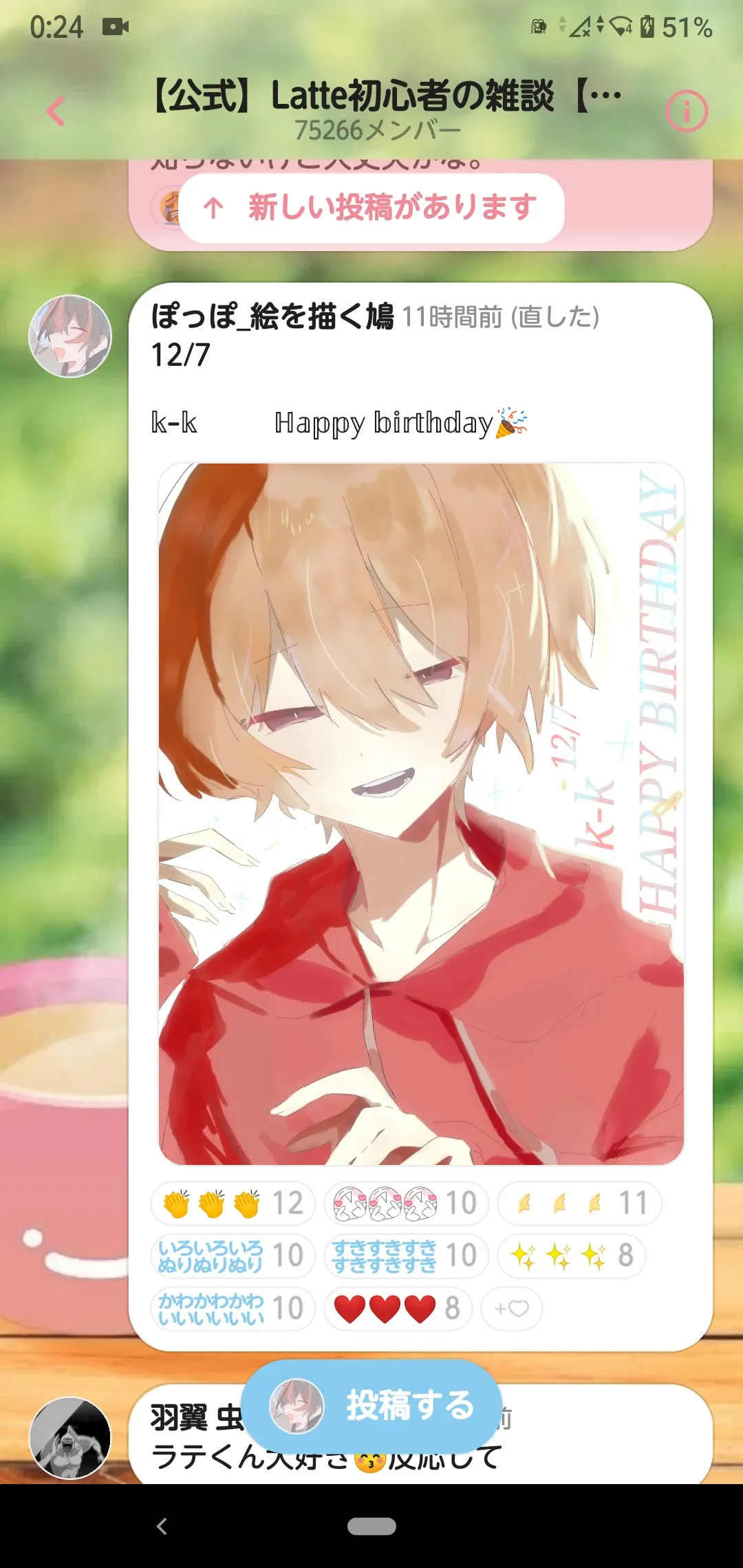 2025/12/13 00:32俺のかふぇで絵描いて投稿してくれた人ごめんね。いつもすぐ反応するけど今は元気なコメントをするのが難しいの。