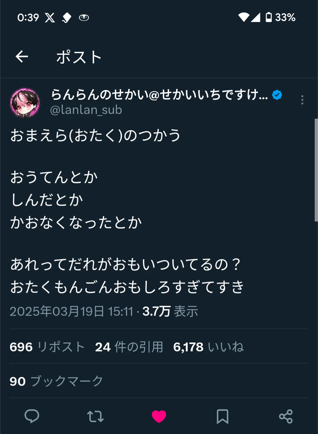 2025/3/20 00:49あたしまじで見た目語彙生活料理や裁縫等の技術と全ての面で女子力しんでるのでねぎちゃははやくあたしと結婚してあたしにおいしいご飯作ってください(((雑草でも食っとれ