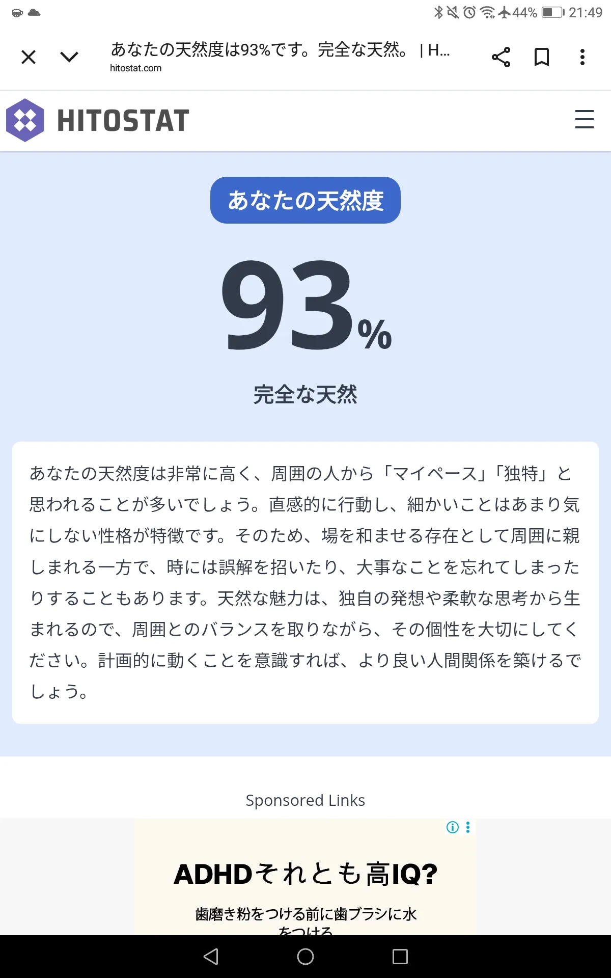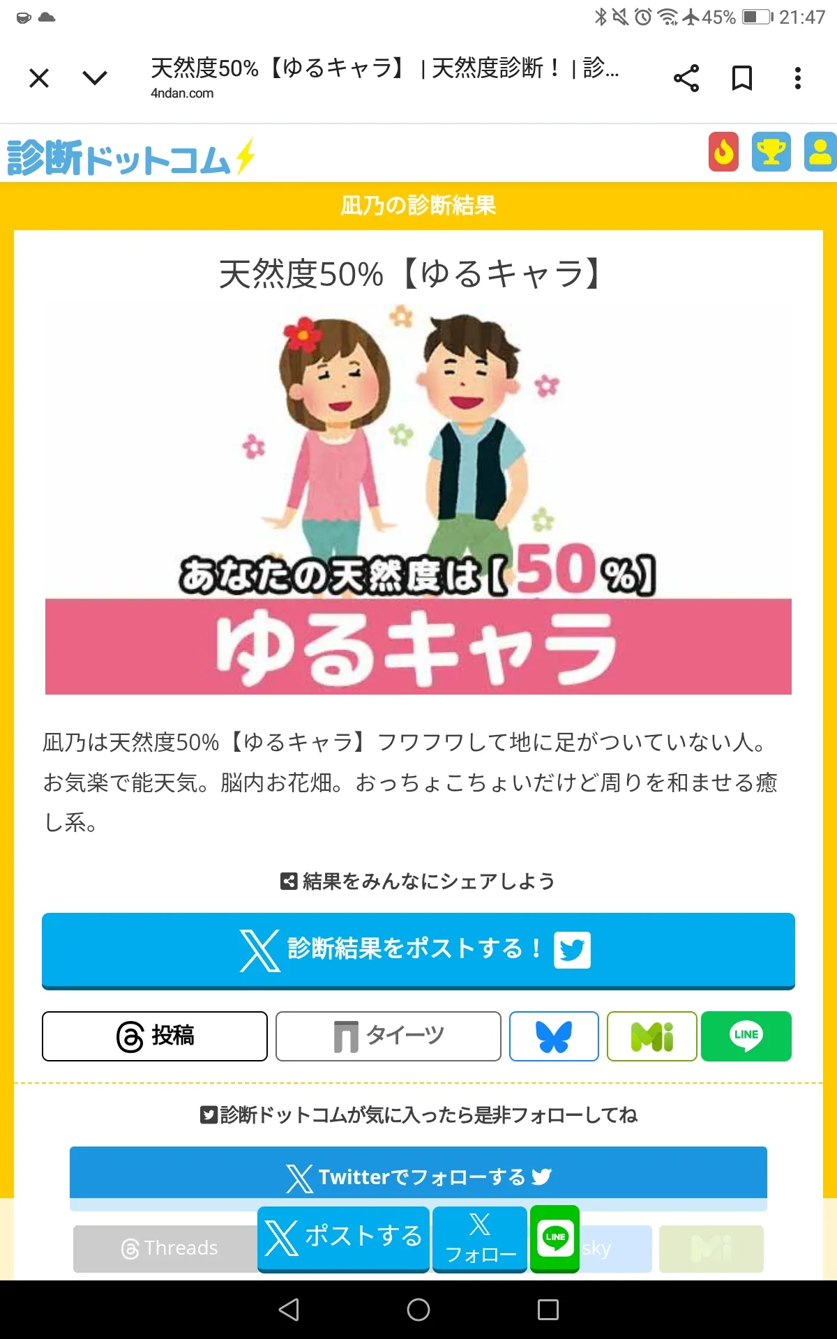 2025/10/7 21:44そういえばくまっちに天然って言われたからまた天然度診断やってくるのよ