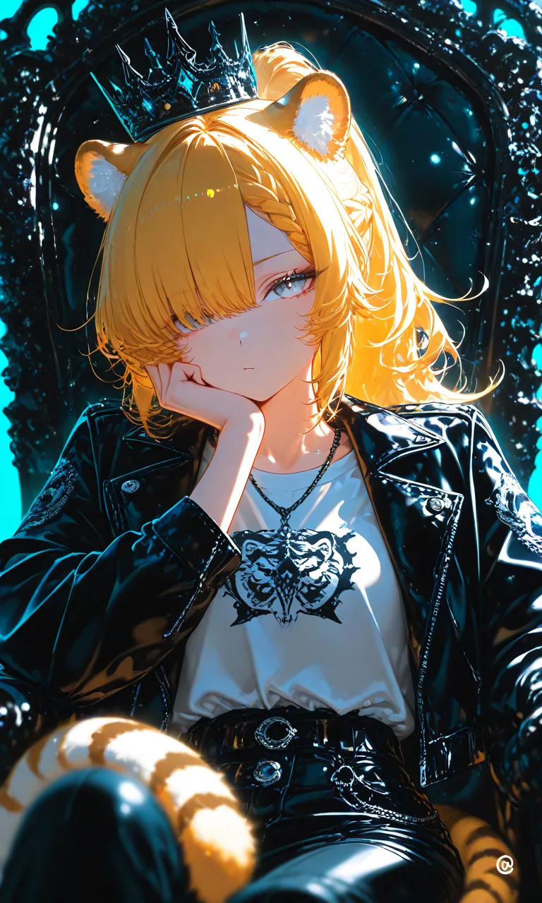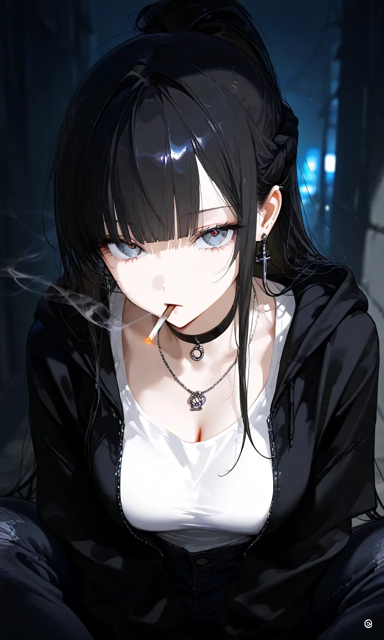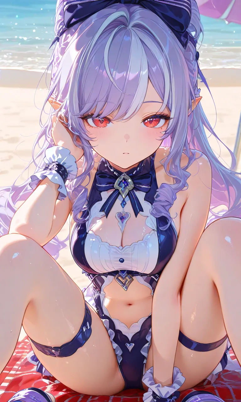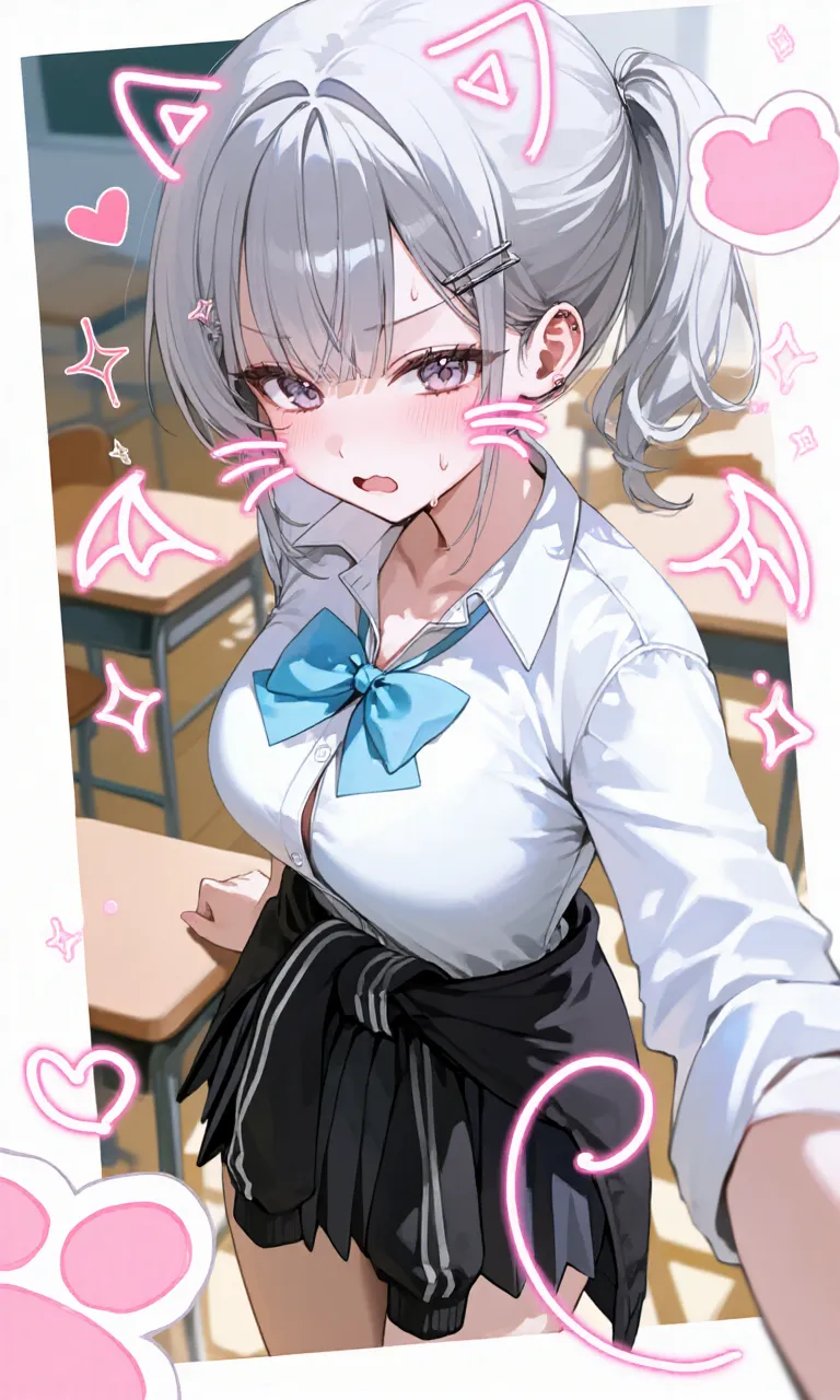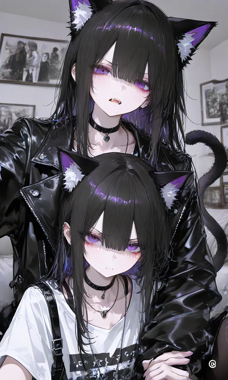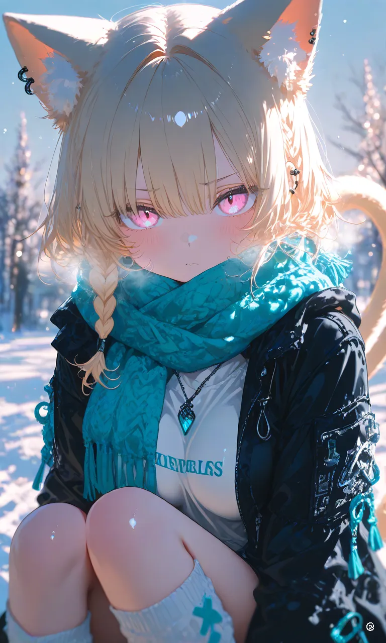 、青い髪で胸でかめ、猫耳、全身青い目白い眉毛白い、