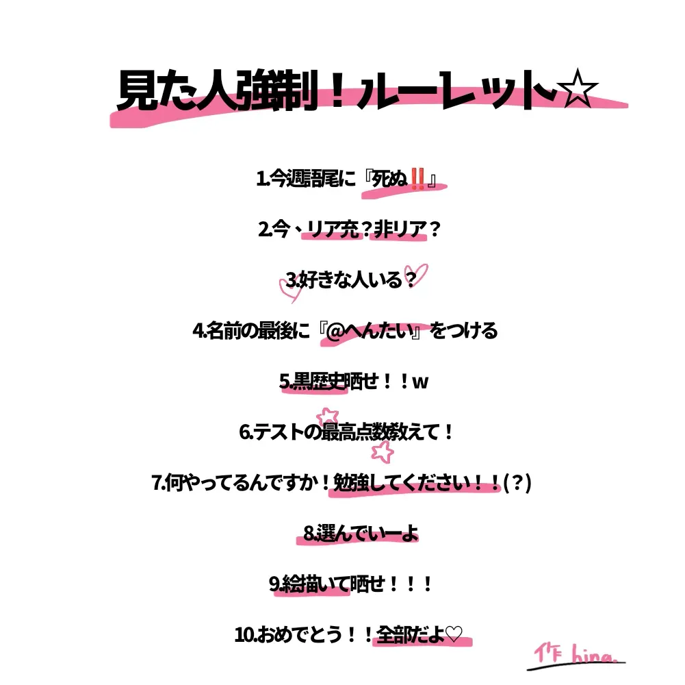 #ルーレットは?1、10のところ三回当たって死ぬ!!2、リア充なう♡3、彼氏いる4、拒否権ねねにあります?5、黒歴史ないよぉ★6、100点満点💯7、勉強してラテ見てますよ‼︎?8、もう全部やってるんですよ💢9、絵は晒します。10、はい、やったよおお