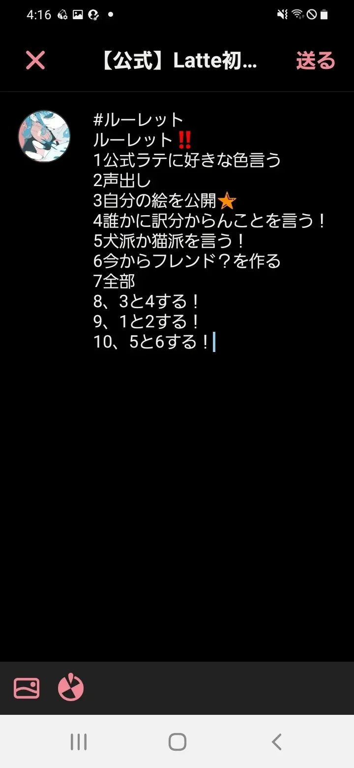 #ルーレットルーレット‼️1公式ラテに好きな色言う2声出し3自分の絵を公開🌟4誰かに訳分からんことを言う!5犬派か猫派を言う!6今からフレンド?を作る7全部8、3と4する!9、1と2する!10、5と6する!えー声出しすんの? 自分の声あんま好きじゃないんだけど…とりま声出しの動画は後で投稿するとして、好きな色はコメに貼る